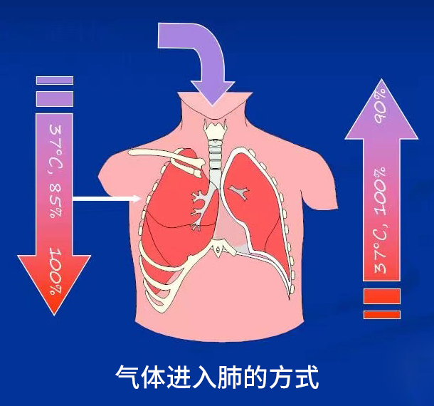 在健康的氣道中,吸氣時,上氣道會對氣體進行加溫濕化。當氣體到達肺部時,其溫度為核心體溫并且被水蒸氣充分飽和,也就是典型的,溫度為 37 °C,絕對濕度 (AH) 為 44 mg/L。