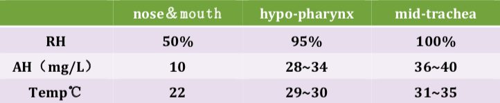 用鼻子呼吸時(shí),吸到隆突上方的氣體已經(jīng)被加熱到接近 36°C ,加濕到含水量 80% 到90% 。氣道各個(gè)部位的溫度、濕度生理參考值見(jiàn)下圖