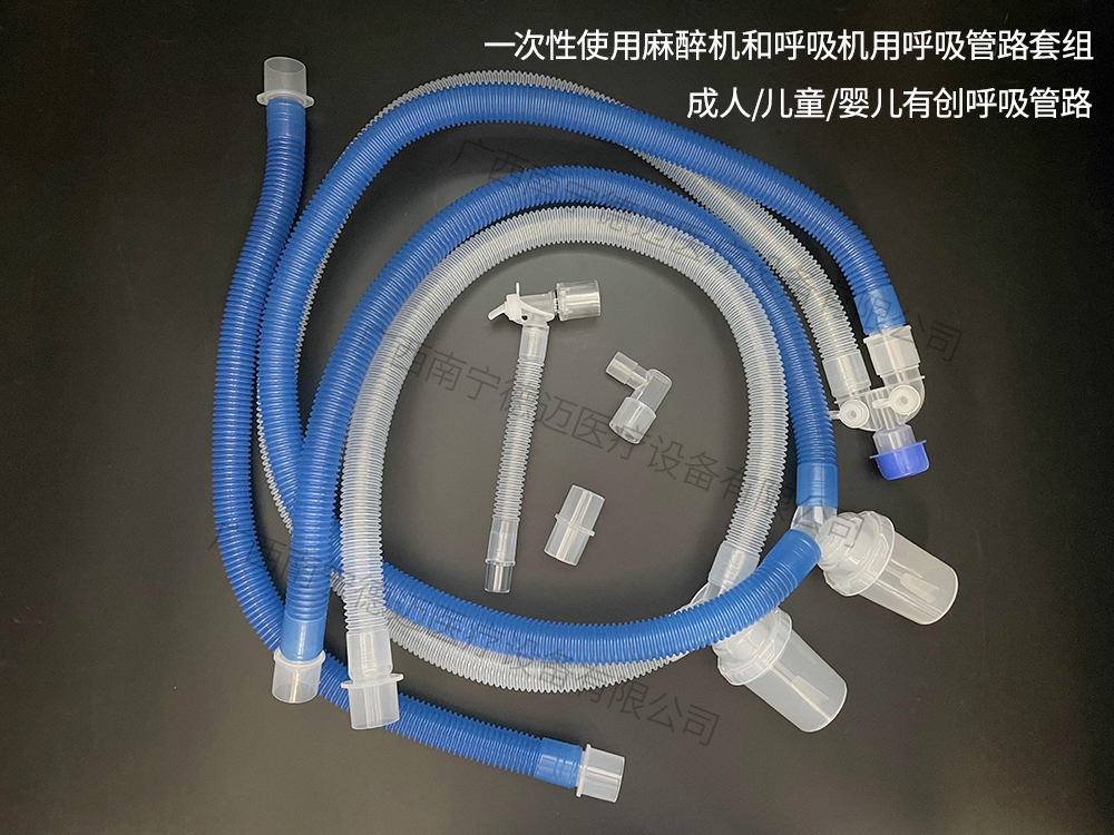 適用范圍: 搭配有創(chuàng)呼吸機使用,適用于麻醉機、呼吸機接口與供氧面罩的管路連接,作為麻醉氣體、氧氣進入人體內(nèi)的通道。 1、結(jié)構(gòu)組成 一次性使用麻醉機和呼吸機用呼吸管路套組包括單管路型和雙管路型,由波紋管、接頭(直型、Y型、L型、T型)、轉(zhuǎn)換接頭、集水杯(選配)、壓力管(選配)、延長管(選配)、單向閥(選配)和儲氣囊(選配)組成。以無菌形式提供,經(jīng)環(huán)氧乙烷滅菌,一次性使用。